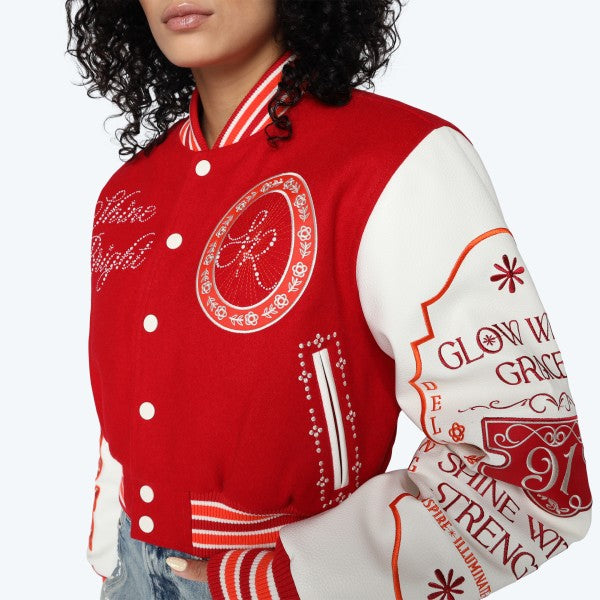 -CROP FIT PEARL VARSITY JACKET -LEA FIT - Relaxed Crop Jacket - Embroidery Patches - Pearls and Rhinestones Detail - Snap Button Front